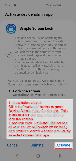 Click the "Activate" button to grant Device Admin rights for the app. This is needed for the app to be able to lock the screen.