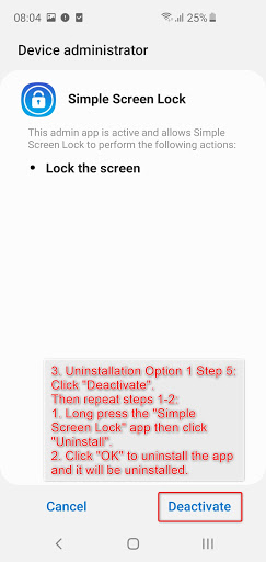 3.2.1.1. Go to “Settings” -> “Security” -> “Device administrators” -> Unselect "Simple Screen Lock" -> Click "Deactivate".