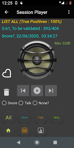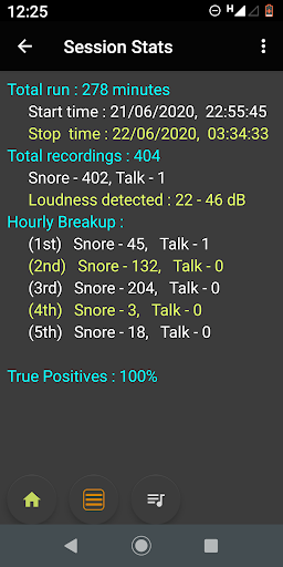 With SnoreLogs you can not only check if you snore or sleep talk but also find out your snoring pattern too. The app records multiple six second clips of snores or talk for the session, positive cases only. However, some false positive cases do get recorded. After the session ends one can get multiple clips, which could be true positives or false positives. If the number of such audio clips is more than 24, then you can validate the session to get the true positive rate for the session. After validating few such sessions, you can infer if this non medical app works for you or not! If the app works for you .... congratulations!, use it along with your anti snoring interventions / remedies to monitor your progress.