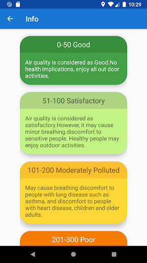 Air Info displays the real time quality of the air of your location and how polluted your air is and displays the measurement of particulate matter (PM2.5 and PM10), Ozone (O3), Nitrogen Dioxide (NO2), Sulfur Dioxide (SO2) and Carbon Monoxide (CO) emissions