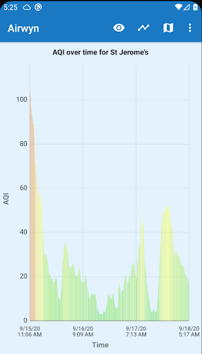 A map gives an overview of AQI in your neighborhood, and lets you pick a PurpleAir or US EPA sensor to monitor. A simple color-coded graph shows how the air quality has changed over the last few days for your chosen sensor.
