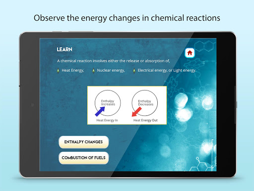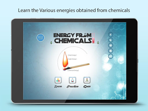 This app is for students in the age group of 11 - 15 years and is optimized for use in tablets of both android and iOS versions. “Energy from Chemicals” app is students friendly and easy to use. Download the app NOW and assist your children to learn the Uses of Chemical Energy, chemical energy sources, the chemicals changes and the energy changes associated with chemicals easily.