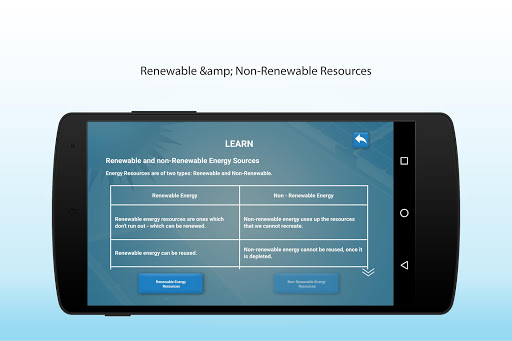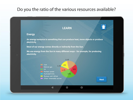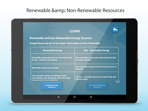 With the objective to make the science concept simple to understand for students, Types of Energy Resources app is an educational app with by high-quality professional animations and illustrations. The app shows the characteristics of renewable and nonrenewable energy resources along with detailed information and experiments for each energy resource. In addition, the app contains interesting activities to learn about energy conservation and sorting recyclable materials.