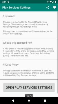 This app is a shortcut to the Android Play Services Settings. These settings are normally accessible by navigating through your settings menu. This app does not create or modify these settings, or the view of these settings.