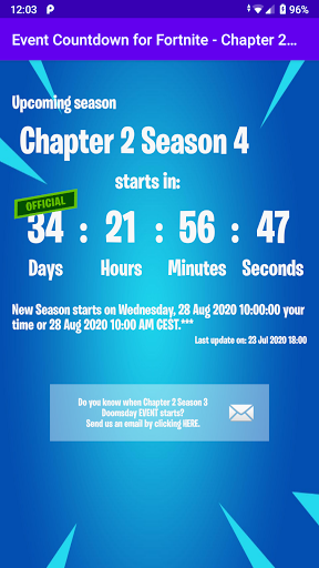 Get notified when official date of next season (Chapter 2 Season 8) start is known. Until current season does not have an official date of The End, app is counting down to estimated date which will later get changed if it is currently set wrongly.