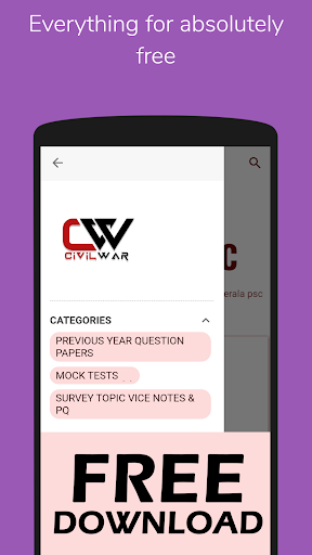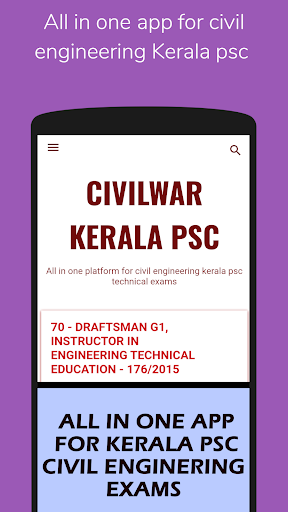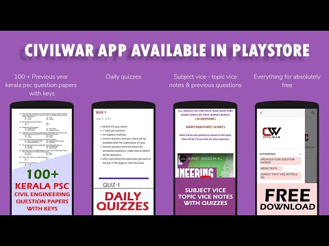 CivilWar is an all in one app for kerala psc civil engineering technical psc exams like overseer, assistant engineer, draftsman, tracer etc for all departments like pwd, harbour, LSGD, irrigation etc. This all contains 100 previous year question papers with official psc final answer keys, topic vice previous questions, subject vice topic vice notes, daily quizzes and much more will be updated daily to the app. All fo this for absolutely free.