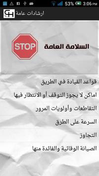 تطبيق يشرح السلامة العامة وقواعد قيادة في الطريق والتقاطعات واولويات المرور وايضا يشرح الاسعافات الاولية لاصابات العظام والنزيف والحروق ويوجد فيه بعض الشواخص المرور المهمة