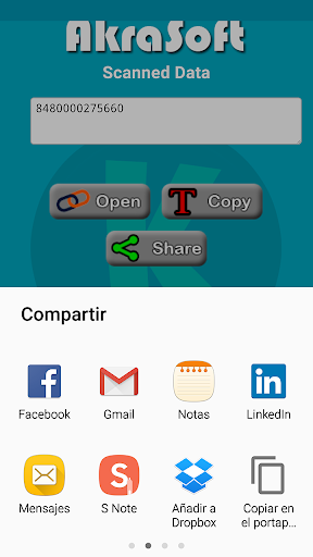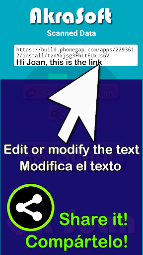 It allows you to read the code, open the link, copy the code or text and share it by any installed messaging or email application. You can add custom text to the code you read before you send or share it.