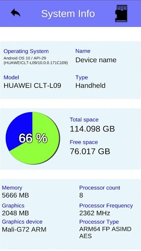 * System tester: Displays the internal fixed memory capacity and the percentage of use. Indicates the name and model of the device. Processor name and type, GPU type and memory, processor speed and number of processors.