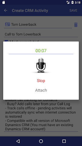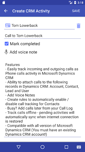 This app provides ability to add calls to Microsoft Dynamics CRM directly from your Android mobile phone.