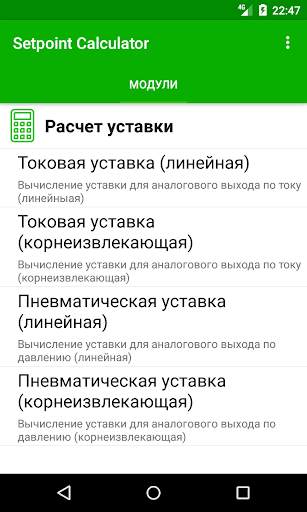 Приложение содержит различные модули для вычисления уставок сигнализаций и блокировок систем АСУ ТП от интеллектуальных датчиков с унифицированными выходными сигналами (ток, пневматика). Расчёт производится для линейных и корнеизвлекающих шкал.