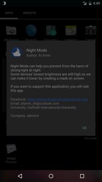 Night Mode can help you prevent from the harm of strong light at night. Some devices lowest brightness are still high so we can make it lower by creating a mask on screen. If you want to support this application, you will rate this app.