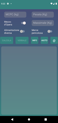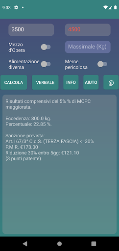 Applicazione utile a FF.OO. ed autotrasportatori per il controllo delle eccedenze di peso ed eventuali infrazioni al Codice della Strada se fuori dai limiti consentiti. L'applicazione consente di inserire la massa complessiva a pieno carico indicata nella carta di circolazione ed il peso accertato mediante pesata, dando anche la possibilità di fare un semplice switch se il veicolo corrisponde ai criteri di alimentazione diversa dal gasolio o mista, nonché se si sta valutando un trasporto di merci pericolose. Come risultato restituisce un valore in eccedenza, sia in kg che in %, con relativa infrazione al CdS ed importi entro i 60gg ed entro i 5gg (riduzione 30%). Calcolata l'eccedenza si ha la possibilità anche di visualizzare la descrizione completa dell'eventuale verbale di contestazione. Infine è presente un tasto info con varie disposizioni ai sensi dell'art.167 CdS.