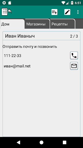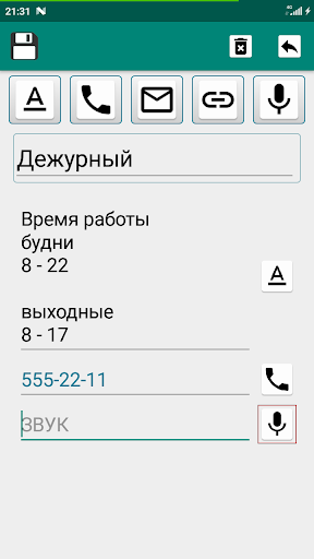 The application is a notebook where notes can be arranged in several folders. The record itself can consist of fields of different types (text, phone, mail, link, sound), which makes it possible to go directly from the application to dialing, sending SMS, browser or email client. You can save backups and send data to third-party sources.