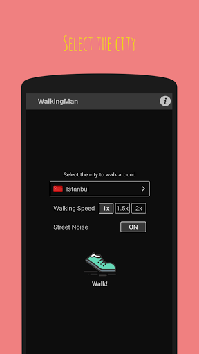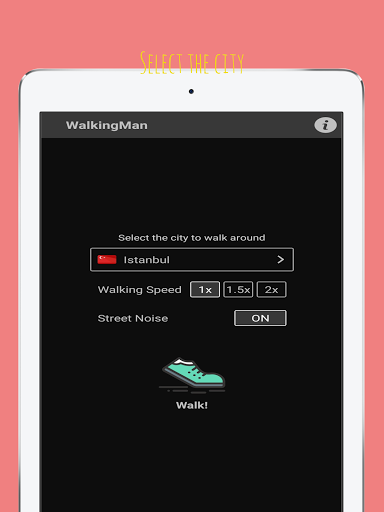 With Walking Man, you can drive anywhere in the world. Moreover, this app also has a radio! -Choose the city you want to visit. -Adjust the walk speed. -Set street sound and radio. -And start the journey.