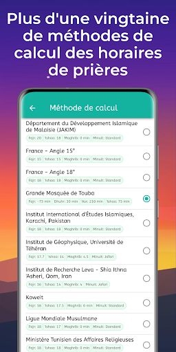 Plus d'une vingtaine de méthodes de calcul sont disponibles dans l'application (parmi lesquelles celle établie par Serigne Mbacké BOUSSO et appliquée dans la ville sainte de Touba et environs) mais aussi d'autres réglages et ajustements manuels.