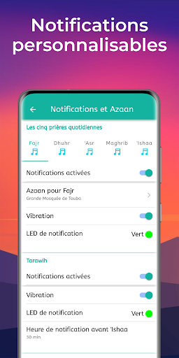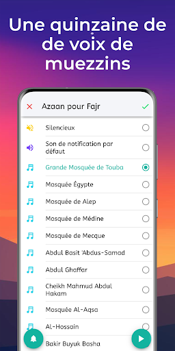 Choisissez vos notifications pour l'appel à la prière avec plusieurs voix de muezzins dont celle de la Grande Mosquée de Touba.