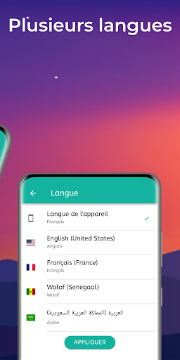 En outre, vous avez la possibilité de choisir une langue parmi l'Anglais, l'Arabe, le Français ou le Wolof.