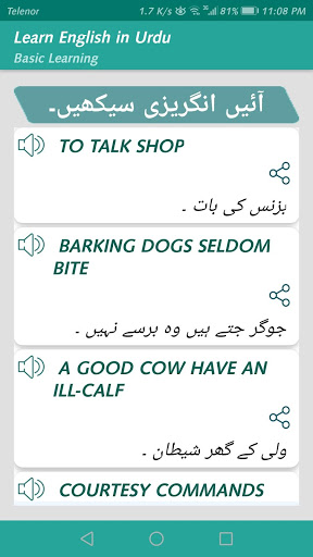 Learning English in Urdu you can use audio to pronounce the English phrases.