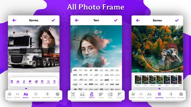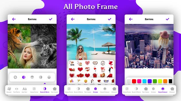 Creative Photo Frame app is all free to download.All Photo Frame has features like collections of Stickers, Typography, Black % White mask photo, Overlay, Color Texts, Frame border, image flip etc.