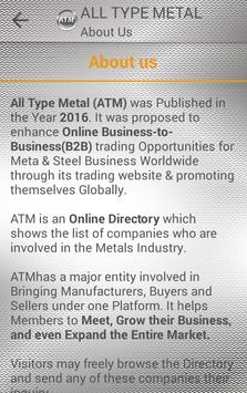 All Type Metal(ATM) App is an Online Metal Directory and a B2B portal for Suppliers, Manufacturers, Traders, Exporters & Wholesalers all under one roof. This app will enable the users to connect to your potential Buyers & Sellers.