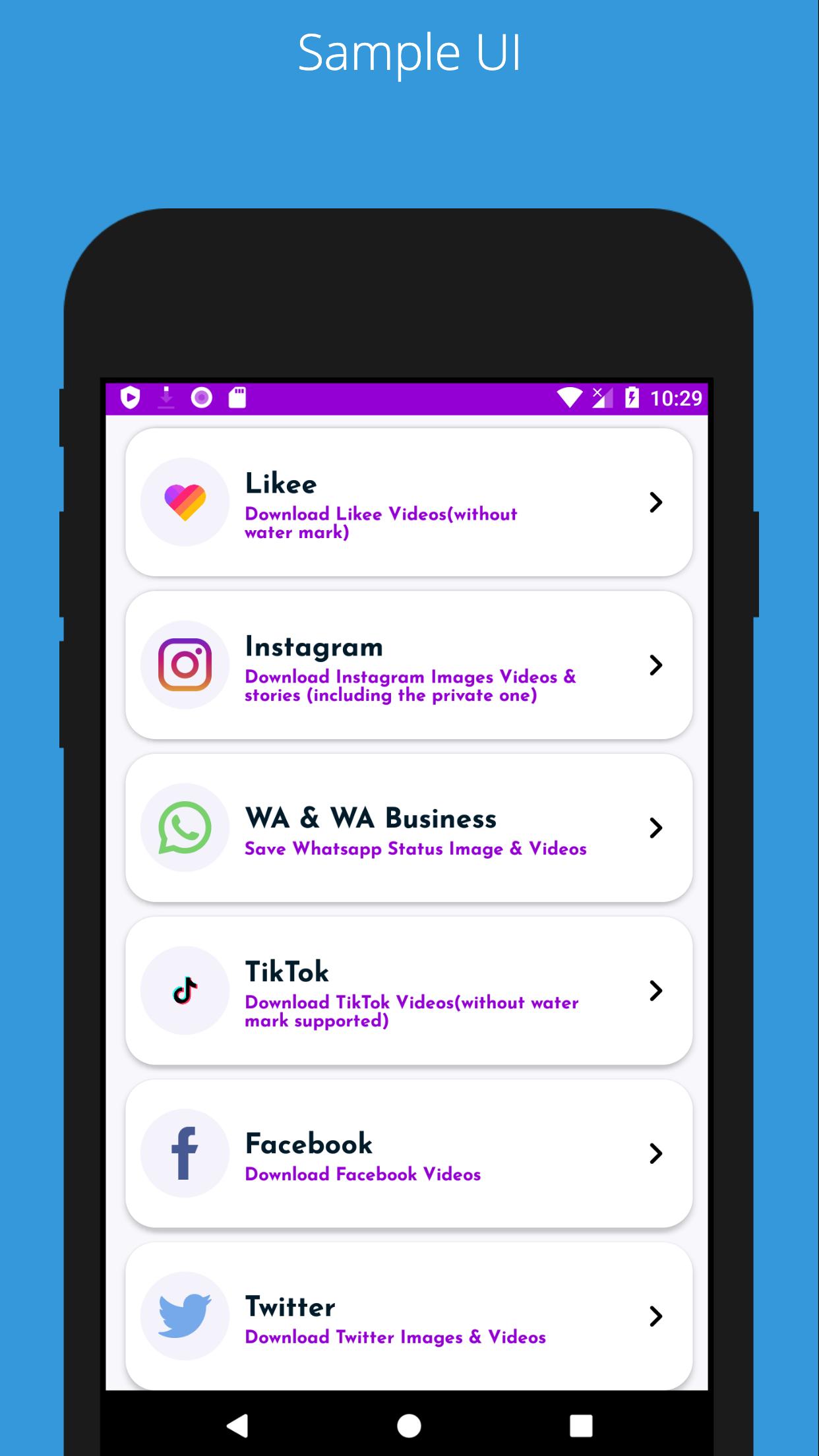 sample UI support all social media apps facebook instagram twitter TikTok likee and whatsapp statues