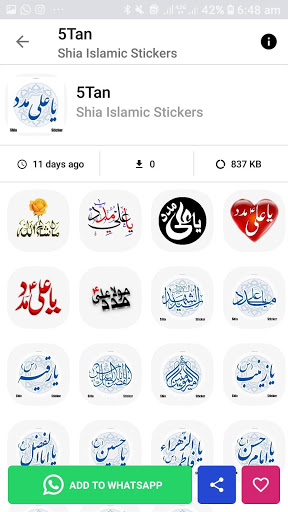 جس میں سب آئمہ معصومین علیھم السلام کی ولادت، شھادت اور اسلامی مناسبتوں، فیلمی، حجاب اور مختلف موضوعات کے اسٹیکر حاصل کر اپنے واٹساپ میں شامل کرسکتے ہیں۔