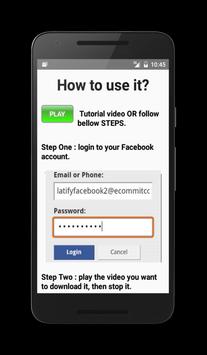 Just login to your Facebook account, then surf it, if you see video, simply click one it, then the app will automatically inform you about the download, with one click on download button the job will be done.