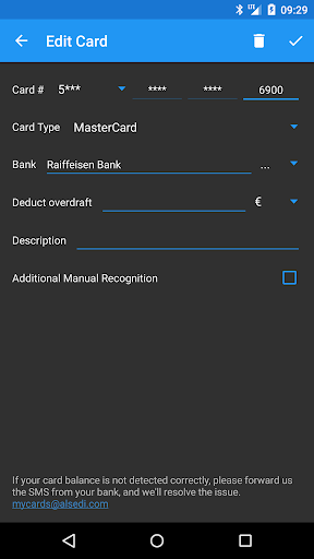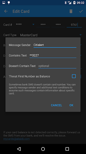 If your card balance is not detected correctly, please forward us the SMS from your bank, and we'll resolve the issue. mycards@alsedi.com