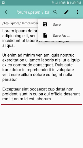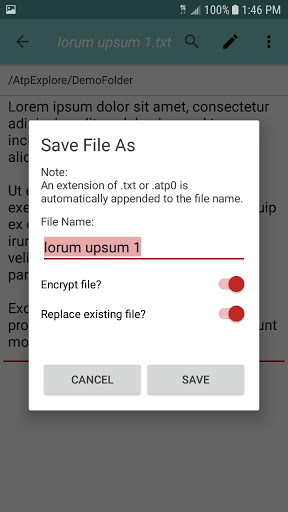 Edit text files with the built in text editor. The text editor has a Save-As option to encrypt your text file before saving it.