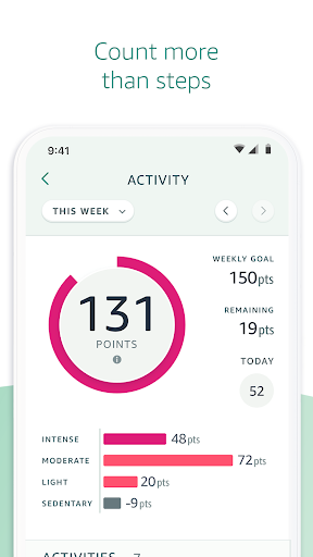 • Informed by guidelines from the American Heart Association, Halo measures the intensity of your activity in addition to tracking steps and sedentary time. This means that working harder—like taking two stairs at a time, or going for a jog—helps you reach your weekly goals faster.