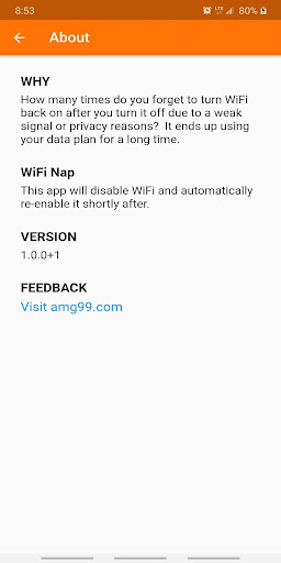 How many times do you forget to turn WiFi back on after you turn it off due to a weak signal or privacy reasons? It ends up using your data plan for a long time. This app will disable WiFi and automatically re-enable it shortly after.