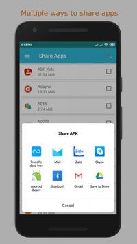 FastShare: APK Sharer provided many ways to share your apps, you can share an app by send the apk file via email, Bluetooth, Facebook messenger..etc..
