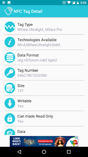 - the type of tag (ex : Mifare Ultralight, NTAG213)