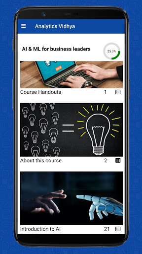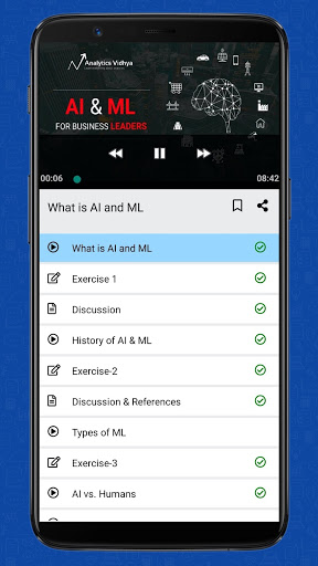 This AI and ML for business leaders app offer you the ultimate free course. This is a completely free course and is for business managers/ leaders who want to understand the current state of AI and Machine Learning, how they are disrupting businesses globally and in diverse fields, how they might generate an impact in your current role and to understand various building blocks of Artificial Intelligence (AI) and Machine Learning (ML). It will also explain why it is necessary for you to have a high-level overview of these topics in today's data-driven world.