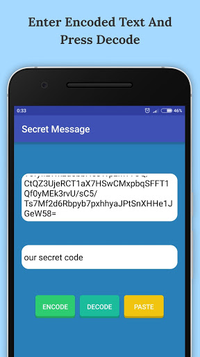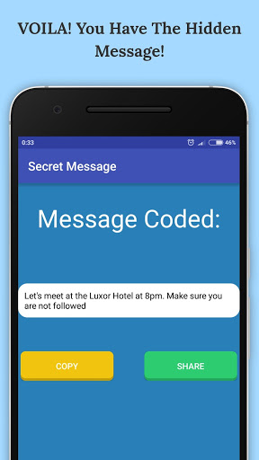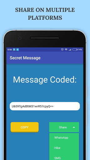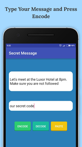 Secret Message allows you to send encoded or encrypted messages via SMS, or other messaging apps. The receiver can decode the hidden messages using the app if he knows the secret key that you used while encoding the message. Like they show in spy movies.