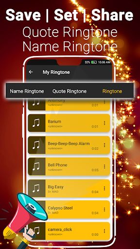 🔔 My Name Ringtone Maker App provide your custom ringtone, personalized free caller ringtones with custom name and quotes 📖. You can create name ringtone with music 🎵. You can create quotes ringtone with music 🎵. You can create music ringtone using any custom names 📛. You can easily set ringtone as phone ringtone 📳, as contact ringtone 📳, as notification ringtone 🛎️, as alert tones ⏰. You can create name ringtone in your language.