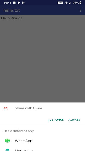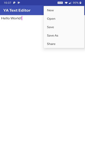 Yet another (YA) text editor lets you to edit text files in android. The application has the feature to open file, save file, to save as file and to share the file using other application like Gmail, WhatsApp etc.