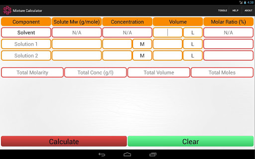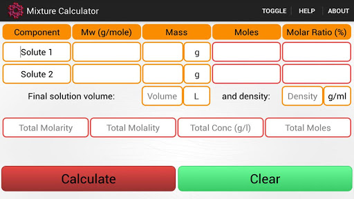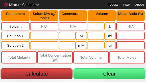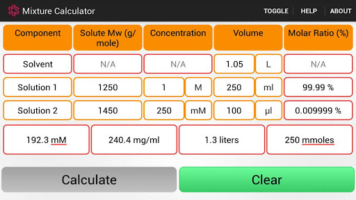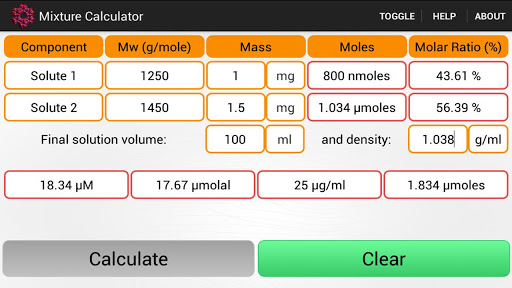 Mixture Calculator is a straightforward tool to deal with complex multicomponent chemical solutions upon their mixing and dilution and solve various more simple problems, like finding moles and weight of solutes.The first activity calculates the concentrations, moles, molar ratios, etc. of the final mixture of several solutions. In most complicated case, the user may input Molar concentrations of two initial solutions, which are going to be mixed, then volumes of these solutions and probably even some volume of pure solvent (to dilute) and then press “calculate” to find molar concentration of the final mixture, total volume, moles and molar ratios of all solutes. Except that, this activity may be used for plenty of small things:Simple dilution: add one solution (anddetails of solute) and pure solvent and get what portions of solution and solvent you need to dilute solution from, lets say, 2M to 25mM.When molar weight of solute is available, then final concentration in mg per ml (mg/ml or equal to g/l) can be calculated, which is helpful for actual preparation of solution. If user doesn't know molar concentrations of initial solutions, then there is an option to change units to mg/ml (must input molar weights of solutes!), press calculate and application will find moles and molar concentration.In the similar way, user can find moles of solute, just by using one row. Input Mw, concentration in mg/mland needed volume and press calculate... .The second activity deals with solid solutes (powders) dissolution. It provides total molarity, molality, mass/volume concentration, moles and molar ratios of dissolved solutes, based upon molar weights, dissolved masses and final solution density. For extended capabilities (customisable database autocomplete etc.) please consider new application in the market: Chemical Solution Wizard. Keywords: chemistry Solution, Mixture, Molar, Molarity, Molality, Concentration, Molecular Weight, Mole, Dilution, Solute, Molar Mass, Density.