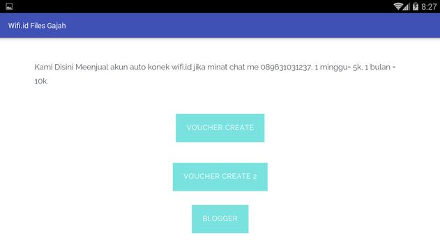 Wifi.id Files Gajah sebuah aplikasi untuk membuat voucher wifi.id gratis, voucher hanya bisa digunakan satu hari dan jika ada yang belum mengerti bisa lihat tutorialnya di https://filesgajah.blogspot.co.id