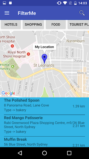 This application lets you search your favourite food places, tourist destinations, hotels, malls, hospitals, personal care and more. Search everything in one go Click on location to open google map for directions