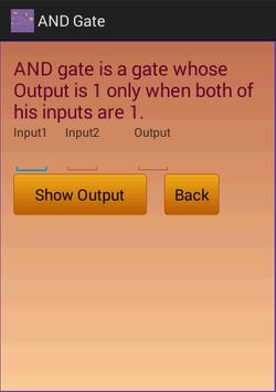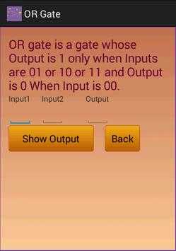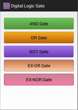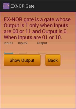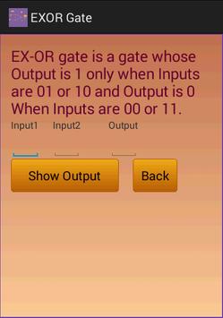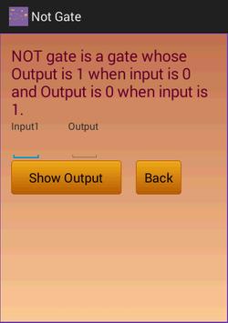 This Application shows information about Digital Logic Gate with Truth Table.It Shows Information of AND gate,OR gate,NOT gate,EX-OR gate and EX-NOR gate with truth tables.When User enters two inputs and click on show output then it shows output.When User click on Back then it goes to previous screen.