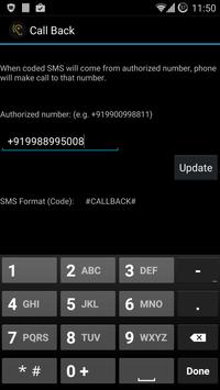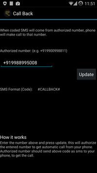 Call Back lets you connect to other phone by automatically getting call from the number, (you need to be authorized first).
