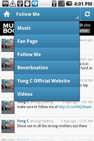 The brand new official Yung C Mobile App is now available! Stream his music, see pictures, check out his bio, see his tweets and Facebook page, and share it all with your friends. Stay connected for the latest updates from Yung C on your mobile device with his free Mobile App. (PLEASE COMMENT AND SHARE)