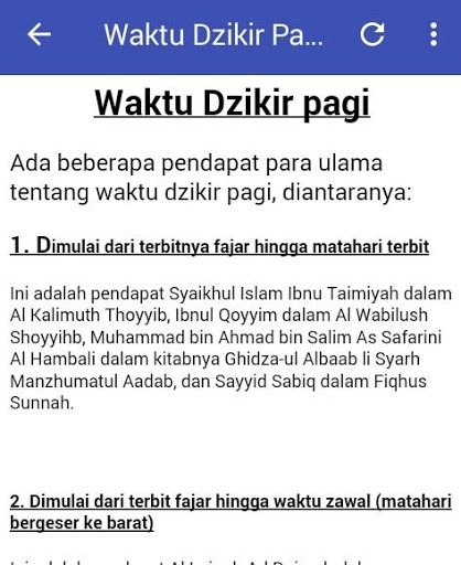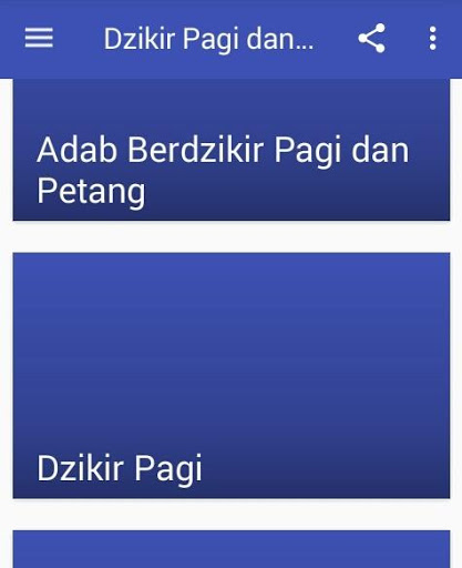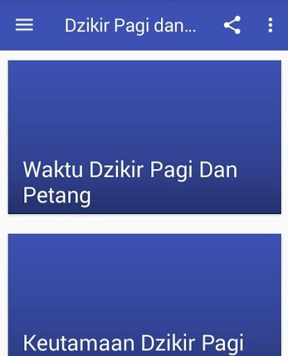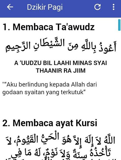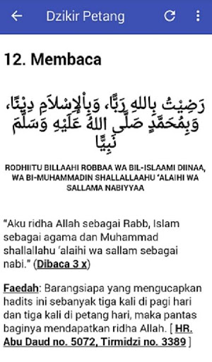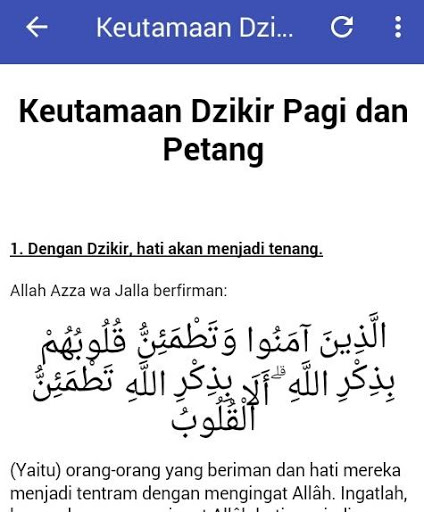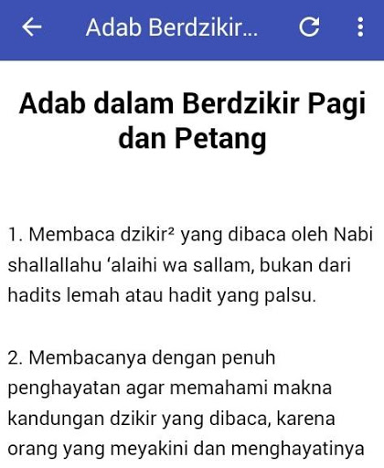 Panduan untuk dzikir pagi dan petang, aplikasi ini dilengkapi dengan keutamaan dzikir, waktu dzikir pagi dan petang, dan adab dalam berdzikir pagi dan petang. Dalam menu dzikir pagi dan petang juga dilengkapi dengan tulisan arab, latin, arti, dan juga faedah dari dzikir, dengan begitu kita bisa lebih paham dengan dzikir yang kita baca, dan lebih khusuk dalam berdzikir.