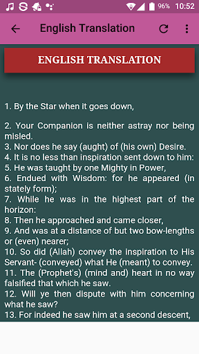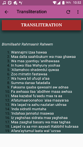 This application contains Arabic Text of the Surah, Complete transliteration of the Surah for easy understanding and following as well as English Translation.