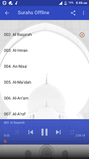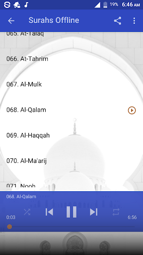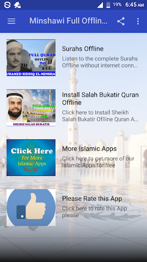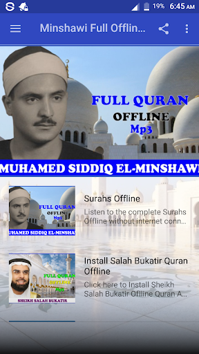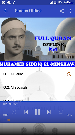 This application brought you Holy Quran mp3 offline recitation by Sheikh Mohamed Siddiq El Minshawi. With this application you can listen to any Surah offline for free without the need of internet connection. Download, Install and enjoy the app.