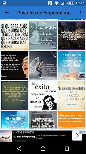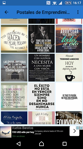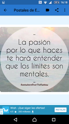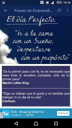 recopilación de bellos carteles de motivación, todos estos carteles contienen frases motivadoras de negocios. La motivación es algo especial que nos llena de energía y entusiasmo. Y ¿Qué es la motivación?, ¿Cómo encontrarla?. Todas estas imágenes ayudan a crecer cada día, a nunca rendirse y ser perseverantes, a querer conquistar el mundo y todo lo que te propongas, ayudan a reflexionar de que cada derrota es una enseñanza y un impulso para volver a intentarlo, ayuda a insertar en la mente de las personas que no se opongan al cambio, que no se rindan en busca de sus sueños, maravillosas postales reflexivas que nos animan y nos inspiran para poder tener el éxito que necesitamos en los negocios, a actuar de manera positiva pese a las circunstancias, ayuda a pensar que los pensamientos negativos son cuestiones mentales capaces de superar. Excelente aplicación motivadora para alcanzar el éxito profesional.