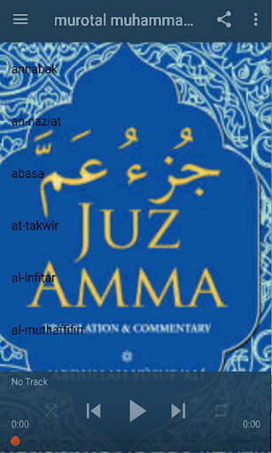 apilikasi yang kami buat lantunan dari ayat-ayat al-quran di mulai dari juz 30 smpai selesai atau yang biasa di sebut juz amma. murotal muhammad toha aljunayd
