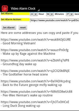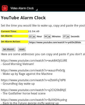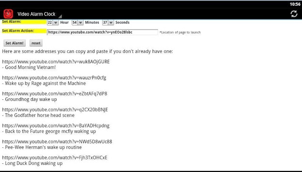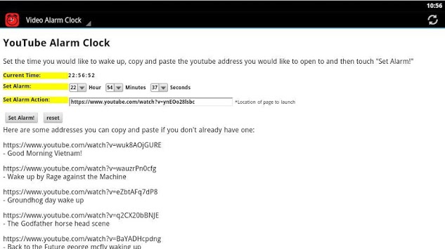 Simply set the time you would like to wake up, paste the address of the video that you would like to wake up to and you're set!